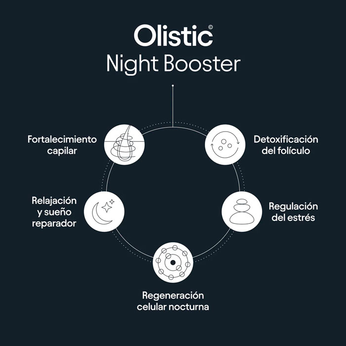 Al complementar tu rutina con Olistic Night Booster, potencias la capacidad de tu cabello para regenerarse mientras disfrutas de un descanso de calidad.