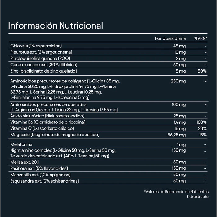 Agua, fructosa de uva, acidulantes (ácido cítrico y ácido fosfórico), bisglicinato de magnesio, aminoácidos precursores de colágeno (L-glicina, L-prolina, L-hidroxiprolina, L-alanina, L-serina,L-leucina, L-fenilalanina, L-isoleucina), extracto de pasiflora 5% flavonoides (Passiflora incarnata, partes aéreas), Night amino complex (L-serina, L-glicina, extracto de té verde descafeinado 40% L-teanina (Camellia sinensis, hojas)), aminoácidos precursores de queratina (L-arginina, L-lisina, L-tirosina), aromas, estabilizantes (celulosa microcristalina y sodio carboximetilcelulosa), extracto de esquisandra 2% schisandrinas (Schisandra chinensis, fruto), extracto de melisa 20:1 (Melissa officinalis, hoja), extracto de manzanilla 1,2% apigenina (Matricaria chamomilla, flor), extracto de cardo mariano 30% silibinina (Sylibum marianum, semillas), chlorella 1% espermidina (Chlorella vulgaris, alga), estabilizante (sucroésteresde ácidos grasos), ácido hialurónico (hialuronato sódico), vitamina C (L-ascorbato cálcico), espesante (goma xantana), bisglicinato de zinc, conservadores (sorbato potásico, benzoato sódico), extracto de champiñón de ostra 2% ergotioneína, 20% beta-glucanos (Pleurotus ostratus, cuerpo fructífero), sal disódica de pirroloquinolina quinona (PQQ), vitamina B6 (clorhidrato de piridoxina), melatonina.