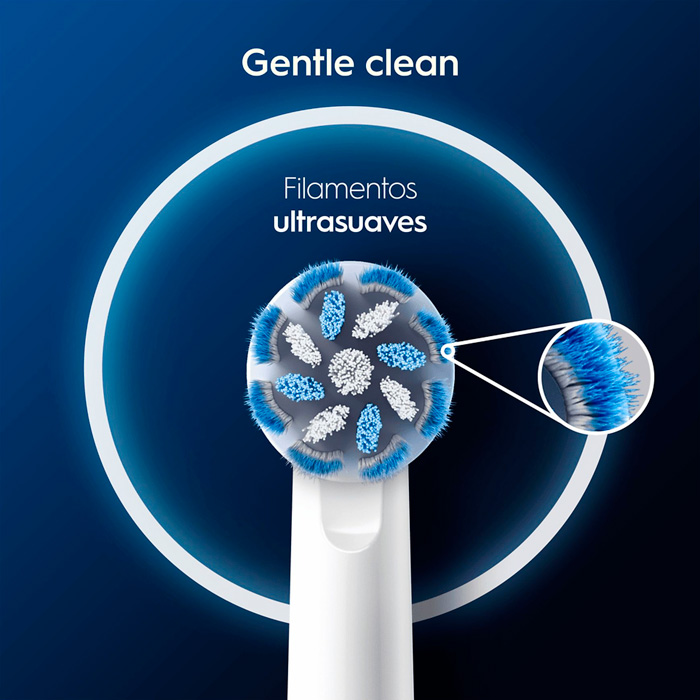 Ofrece una limpieza superior frente a un cepillo manual normal, y está diseñado para quienes desean una experiencia de cepillado suave pero eficaz. El cabezal Sensitive Clean funciona con la tecnología única de Oral-B que oscila, rota y pulsa, permitiendo a los filamentos rodear cada diente para una limpieza diente a diente sorprendente.