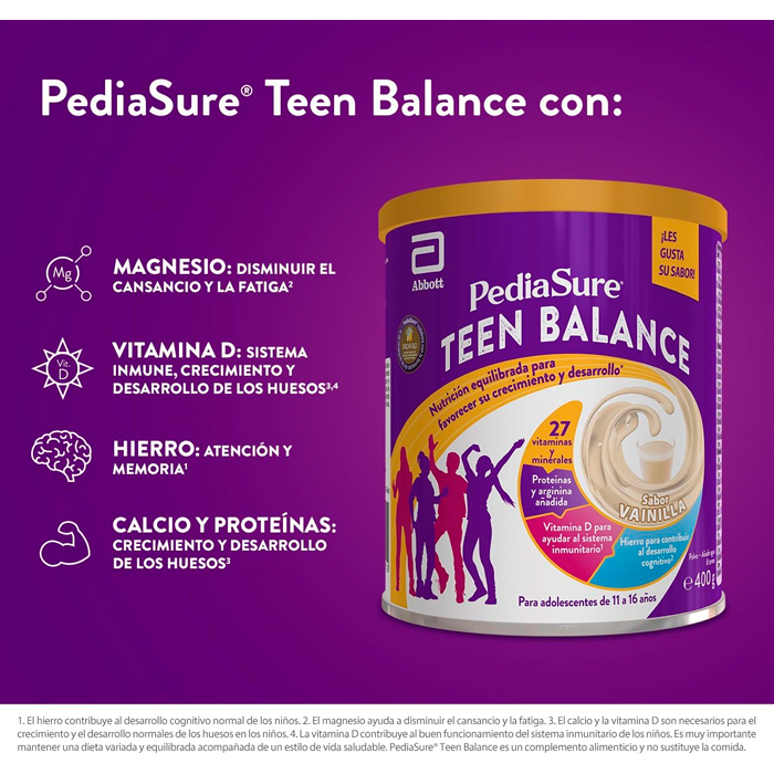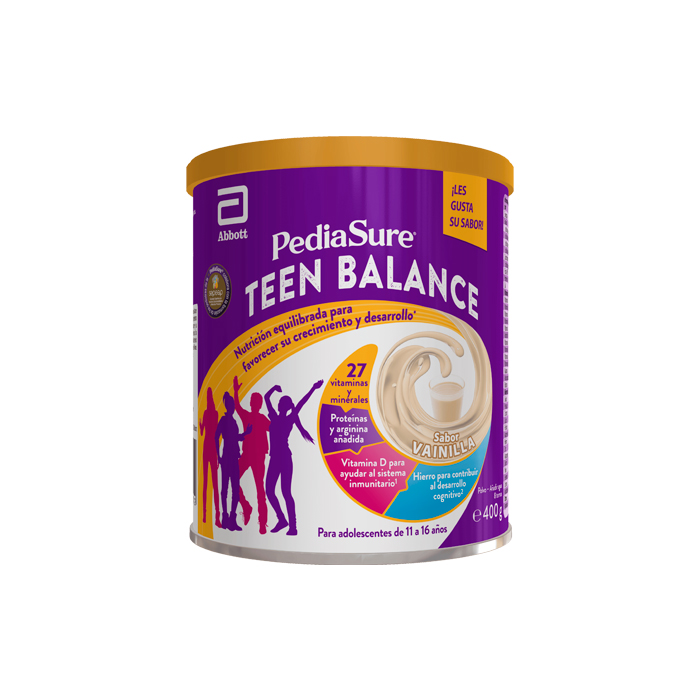 Pediasure Teen Balance Vainilla es un complemento alimenticio en polvo con sabor a chocolate diseñado específicamente para satisfacer las necesidades nutricionales de adolescentes entre 11 y 16 años.