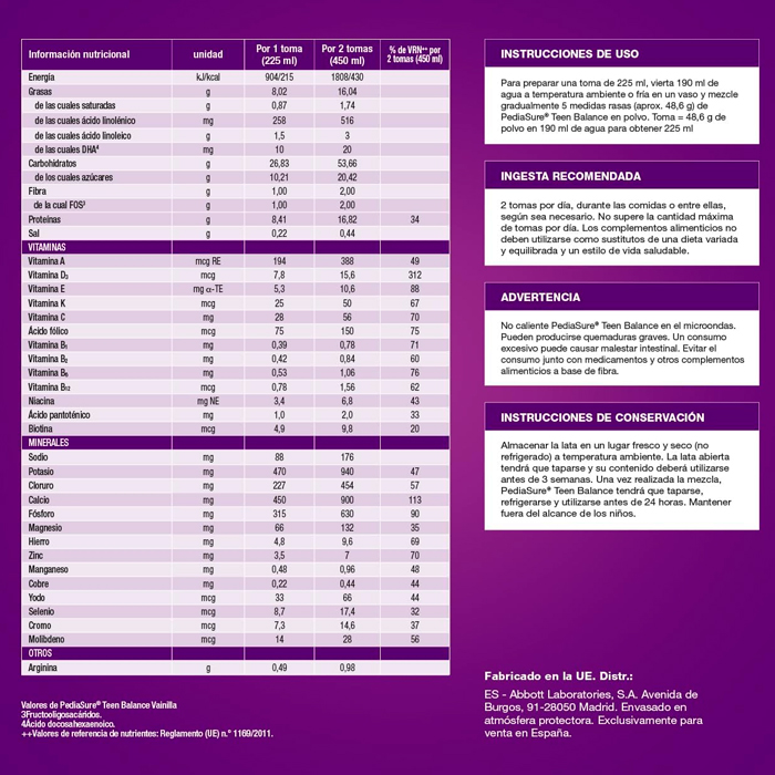 Para preparar una toma de 225 ml, vierta 190 ml de agua a temperatura ambiente o fría en un vaso y mezcle gradualmente 5 medidas rasas (aprox. 49,1 g) de PediaSure Teen Balance en polvo. Toma = 49,1 g de polvo en 190 ml de agua para obtener 225 ml. Se puede calentar pero no por encima de los 35ºC para mantener las propiedades nutricionales.