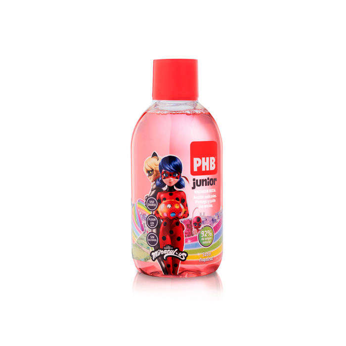 El Enjuague Bucal PHB Junior ayuda a remineralizar el esmalte y proteger contra la caries. Ofrece doble acción anticaries gracias a su formula con un 92% de origen natural que contiene 226 ppm de ion flúor y 1% Xilitol. Colutorio con sabor tropical.