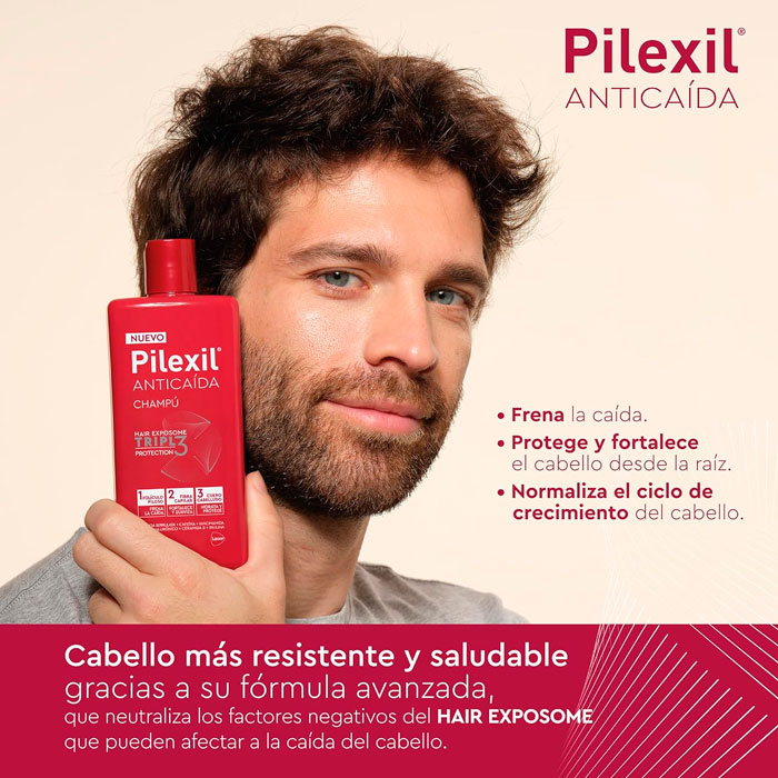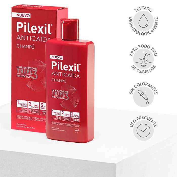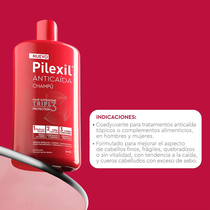 Pilexil Champú Anticaída Tripl3 Protection frena la caída del cabello y combate los efectos del entorno.