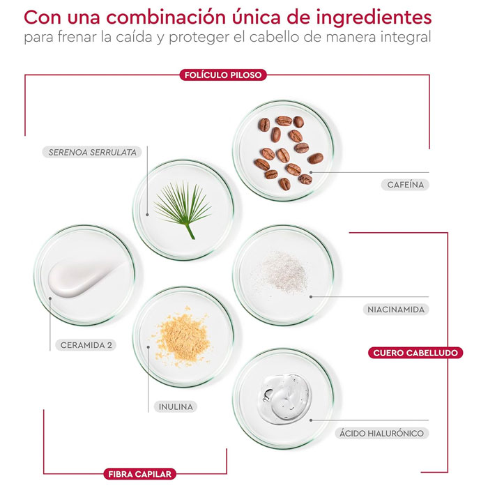 Su fórmula avanzada está diseñada para una acción integral en 3 niveles: el folículo piloso, la fibra capilar y el cuero cabelludo.