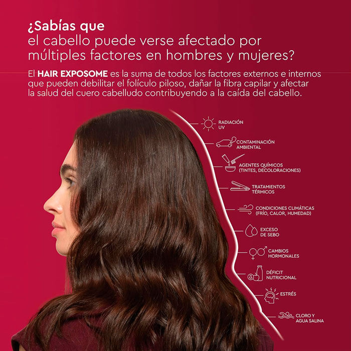 Esta combinación de ingredientes devuelve la vitalidad y fuerza al cabello, neutralizando los efectos negativos del Hair Exposome (contaminación, radiación UV, estrés, etc.), factores que pueden debilitar el cabello y contribuir a la caída y pérdida de densidad.
