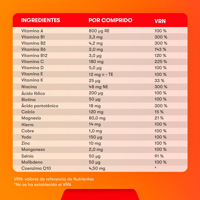 Acidulante: Ácido cítrico; Corrector de acidez: Carbonato ácido de sodio; Agente de carga: Sorbitol; Carbonato cálcico; Sulfato magnésico; Agente de carga: Isomalt; Ácido L-ascórbico; Carbonato magnésico; Colorante: Beta-caroteno; Aroma de zumo de naranja; Corrector de acidez: Carbonato sódico; Pirofosfato férrico; Coenzima Q10; Nicotinamida; Antiaglomerante: Polivinilpirrolidona; Acetato de DL-alfa tocoferilo; Palmitato de retinilo; Citrato de cinc; Potenciador del sabor: Cloruro sódico; Aroma de fruta de la pasión; Edulcorante: Aspartamo; D-pantotenato cálcico; Edulcorante: Acesulfamo potásico; Colorante: Polvo de zumo de remolacha roja; Selenito sódico; Riboflavina-5’-fosfato sódico; Antiespumantes: Manitol, Sucroésteres de los ácidos grasos, Polisorbato 80, Dimetilpolisiloxano, Dióxido de silicio; Sulfato de manganeso; Molibdato sódico; Clorhidrato de tiamina; Cianocobalamina; Yoduro potásico; Citrato cúprico; Piridoxina clorhidrato; Colecalciferol; Fitomenadiona; Ácido pteroilmonoglutámico; D-biotina.