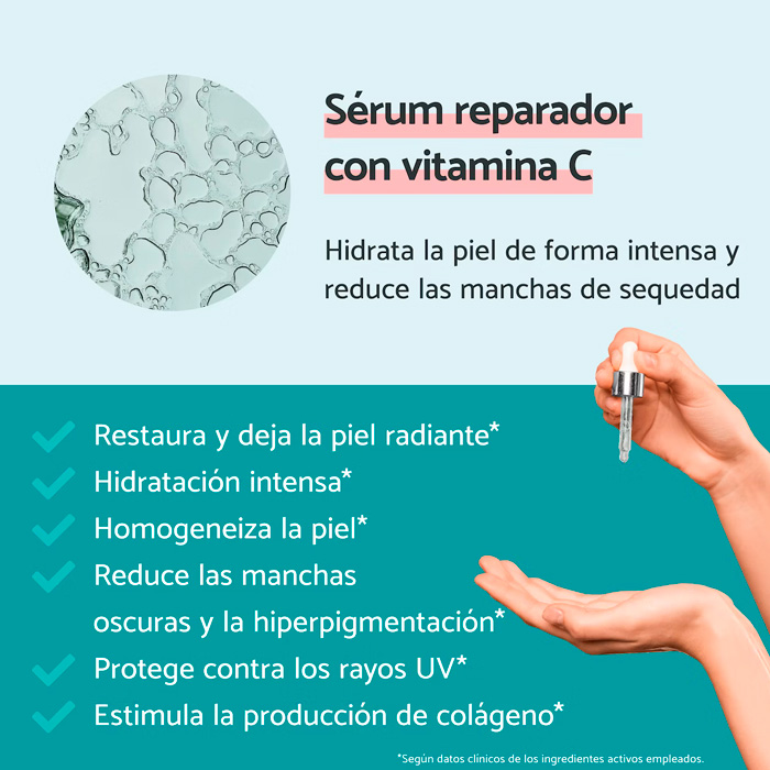 Serum Reparador Remescar Vitamina C & Ácido Hialurónico reduce las manchas oscuras y la hiperpigmentación. Ayuda a proteger contra los rayos UV mientras repara la piel dañada por el sol. La piel se ve más sana al reducir el enrojecimiento y suavizar la piel, aportando también un tono de piel más uniforme. Así mismo, se estimula la producción de colágeno para conseguir una piel más firme y lisa.