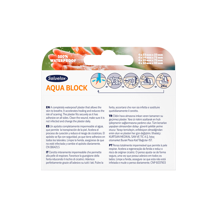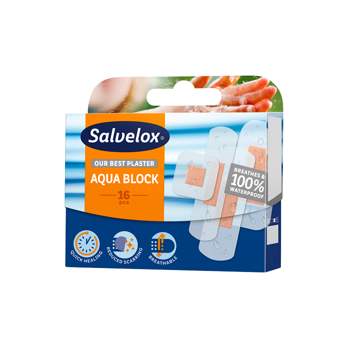 Salvelox Aqua Block son apóstios indicados para proteger tus heridas del agua, la suciedad y las bacterias mientras aceleras el proceso de curación y reduces el riesgo de cicatrices.