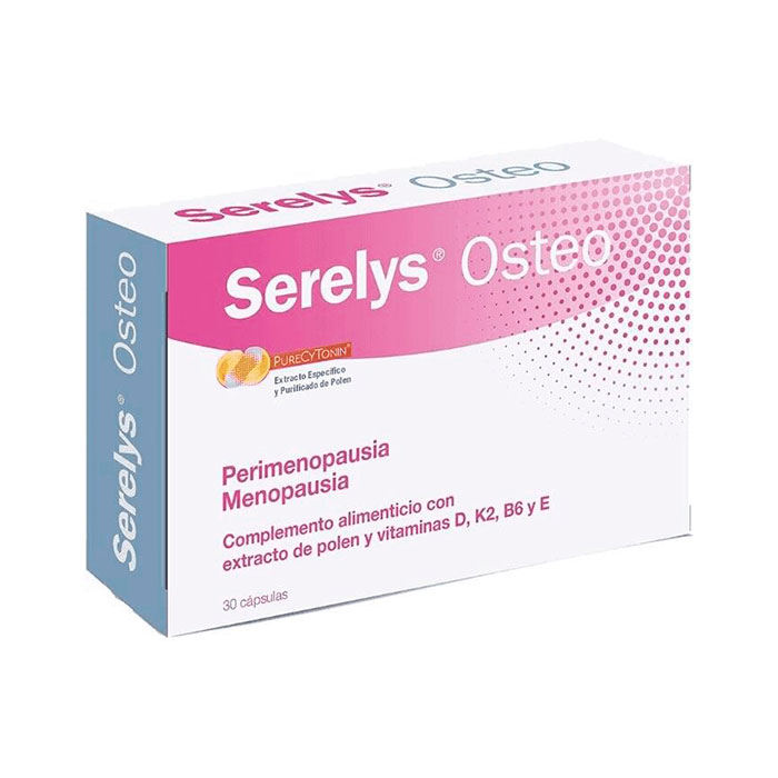 Serelys Osteo es un complemento alimenticio que contribuye a mantener la salud ósea durante la menopausia y también ayuda a controlar los sofocos en esta etapa de la vida. Contiene extracto de polen, que contribuye al bienestar y al confort durante la menopausia, y vitaminas. La vitamina D mejora la absorción y utilización normal del calcio y el fósforo, la vitamina K ayuda al mantenimiento de los huesos en condiciones normales, la vitamina B6 contribuye a reducir el cansancio y la fatiga y la vitamina E contribuye a la protección de las células frente al daño oxidativo.