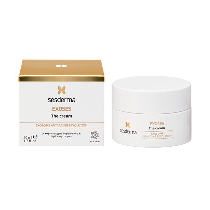 Sesderma Exoses The Cream es una innovadora crema antiedad que combina la última tecnología en exosomas con potentes activos para combatir los signos del envejecimiento, reducir las manchas y fortalecer la barrera cutánea.