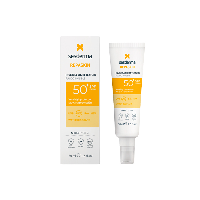 Sesderma Repaskin Fluido Invisible SPF50+ es un fotoprotector facial que ofrece una protección solar muy alta contra los rayos UVB, UVA, infrarrojos y luz azul, a la vez que presenta una textura fluida ultraligera de rápida absorción que no deja residuos grasos ni efecto blanquecino.