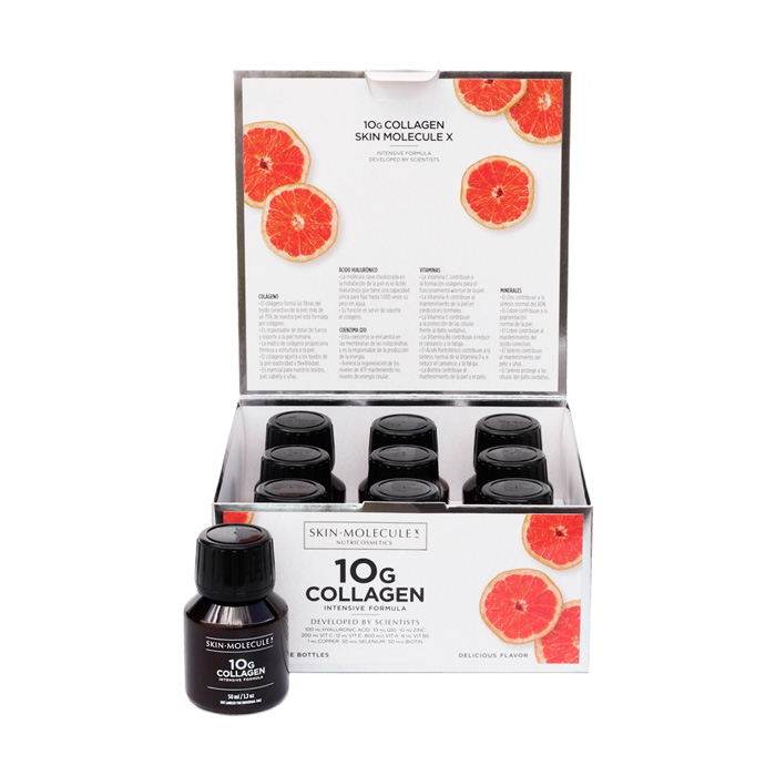 Skin Molecule X 10g Collagen es un complemento alimenticio diseñado para aportar una dosis complementaria de Colágeno, Ácido Hialurónico, Coenzima Q10, minerales y vitaminas, adecuados para el cuidado de la piel.