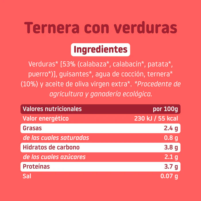 Verduras* [53% (calabaza*, calabacín*, patata*, puerro*)], guisantes*, agua de cocción, ternera* (10%) y aceite de oliva virgen extra*. *Procedente de agricultura y ganadería ecológica.