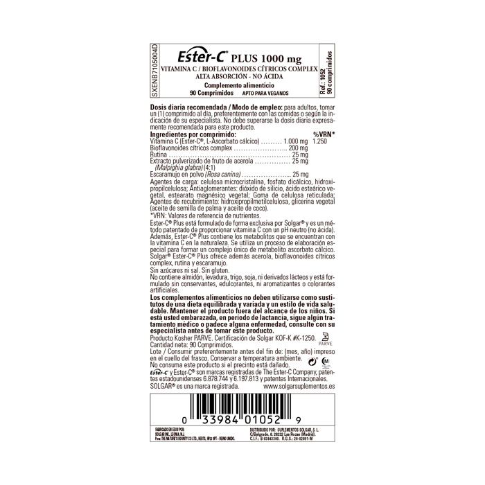 Vitamina C (Ester-C®, L-Ascorbato cálcico), Bioflavonoides cítricos complex, Rutina, Extracto pulverizado de fruto de acerola (Malpighia glabra) (4:1), Escaramujo (Rosa canina) en polvo. Agentes de carga: celulosa microcristalina, fosfato dicálcico, hidroxipropilcelulosa; Antiaglomerantes: dióxido de silicio, ácido esteárico vegetal, estearato magnésico vegetal; Goma de celulosa reticulada; Agentes de recubrimiento: hidroxipropilmetilcelulosa, glicerina vegetal (de aceite de semilla de palma y aceite de coco).