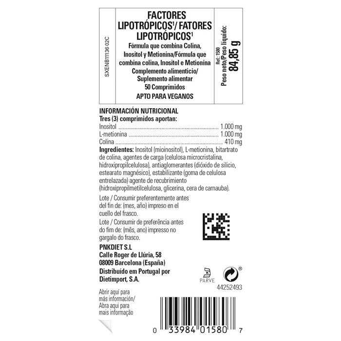 Inositol (mioinositol), L-metionina, bitartrato de colina, agentes de carga (celulosa microcristalina, hidroxipropilcelulosa), antiaglomerantes (dióxido de silicio, estearato magnésico), estabilizante (goma de celulosa entrelazada), agentes de recubrimiento (hidroxipropilmetilcelulosa, glicerina, cera de carnauba).