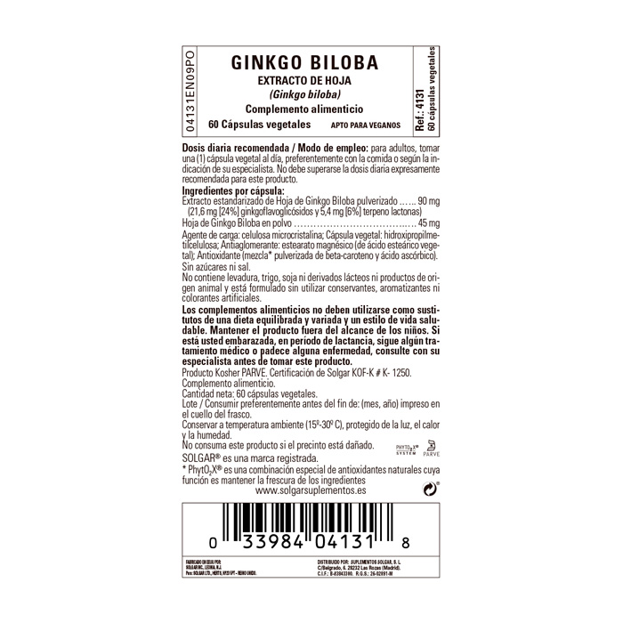 Extracto estandarizado de hoja de Ginkgo Biloba pulverizado, Hoja de Ginkgo Biloba en polvo. Agente de carga: celulosa microcristalina. Cápsula vegetal: hidroxipropilmetilcelulosa; Antiaglomerante: estearato magnésico (de ácido esteárico vegetal). Antioxidante: mezcla pulverizada de beta-caroteno y ácido ascórbico.