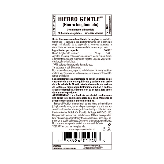 Solgar Hierro Gentle es un complemento alimenticio indicado para personas que no pueden tomar los complementos alimenticios de hierro tradicionales y/o que les provocan malestar, estreñimiento y problemas intestinales.