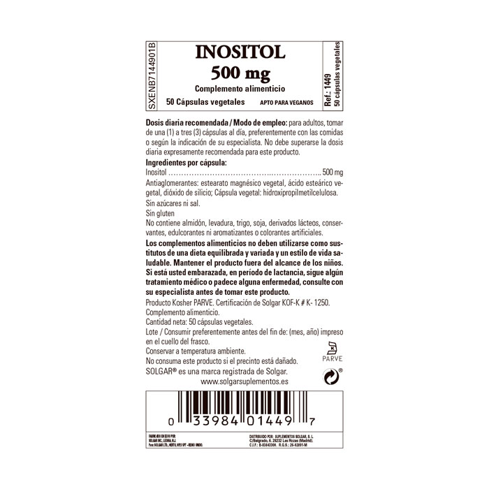Tomar de 1 a 3 cápsulas de Solgar Inositol 500 mg al día.