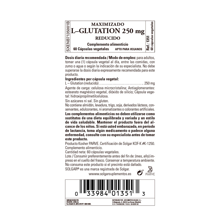L-Glutatión (reducido). Agente de carga: celulosa microcristalina; Antiaglomerantes: estearato magnésico vegetal, dióxido de silicio; Cápsula vegetal: hidroxipropilmetilcelulosa.