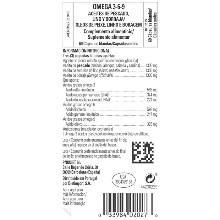 Agente de recubrimiento (gelatina de bovino, glicerina); Aceite de pescado (anchoa, arenque, caballa y sardina); Aceite de semillas de lino (Linum usitatissimum); Aceite de borraja (Borago officinalis); Antioxidante (mezcla de tocoferoles).