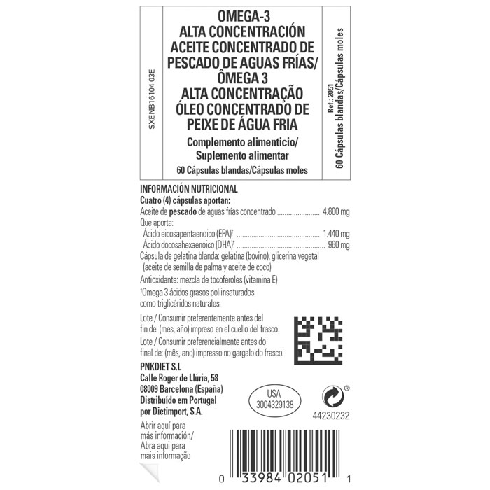 Aceite de pescado de aguas frías concentrado; Cápsula de gelatina blanda: gelatina (bovino), glicerina vegetal (aceite de semilla de palma y aceite de coco); Antioxidante: mezcla de tocoferoles (vitamina E).