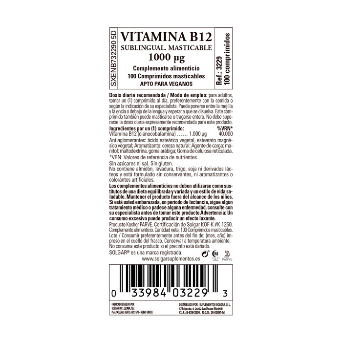 Vitamina B12 (cianocobalamina). Antiaglomerantes: ácido esteárico vegetal, estearato magnésico vegetal; Aromatizante: cereza natural; Agente de carga: manitol; maltodextrina, goma arábiga; Goma de celulosa reticulada.