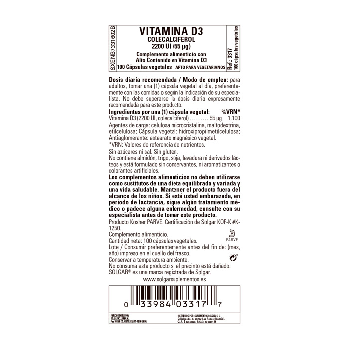 Dietética > Complejos Vitamínicos > Vida Diaria > Solgar Vitamina D3 2200 Ui 55 µg 100 Cápsulas Vegetales
