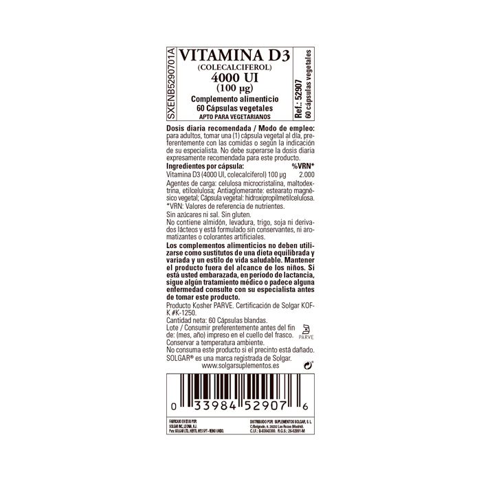 Vitamina D3 (4000 UI, colecalciferol). Agentes de carga: celulosa microcristalina, maltodextrina, etilcelulosa; Antiaglomerante: estearato magnésico vegetal; Cápsula vegetal: hidroxipropilmetilcelulosa.