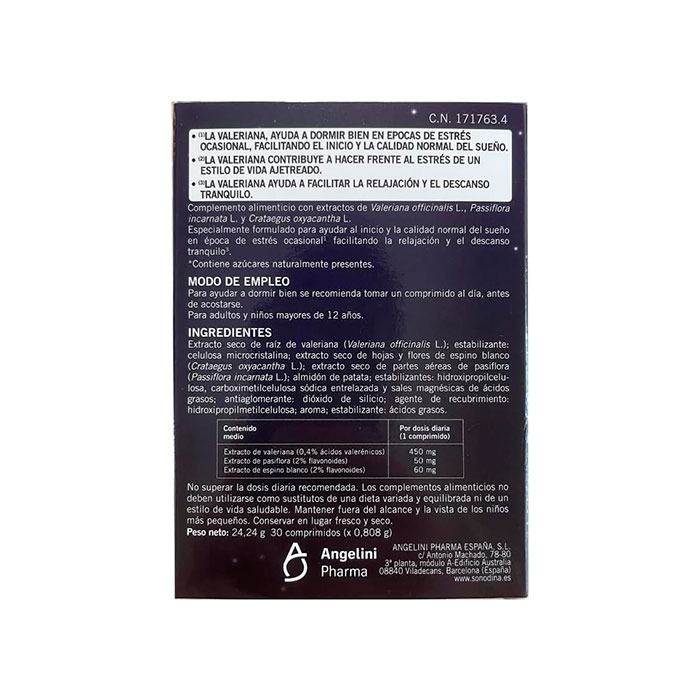 Extracto seco de raiz de valeriana (Valeriana officinalis L.): estabilizante: celulosa microcristalina; extracto saco da hojas y.flores de espino blanco (Cratadgus axyacantna L.) extracto seco de, partes aéreas de pas flora (Passiliora incamata L.): almidon de patata: estabilizantes: hidroxipropilcelulosa, carboximetilcelulosa sodica entrelazada y sales magnés cas de ácidos grasos; antiaslomerante: dióxido de silicio, agente de recubrimientos idroxipropilmetilcelulosa; aroma; estabilizanto: acidos grasos.
