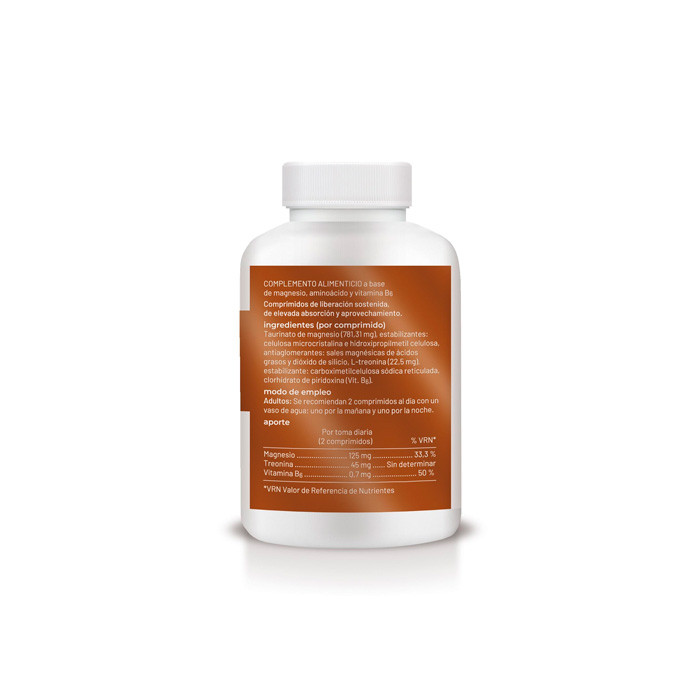 Taurinato de magnesio (781,31 mg), estabilizantes: celulosa microcristalina e hidroxipropilmetil celulosa, antiaglomerantes: sales magnésicas de ácidos grasos y dióxido de silicio, L-treonina (22,5 mg), estabilizante: carboximetilcelulosa sódica reticulada, clorhidrato de piridoxina (Vit. B6).