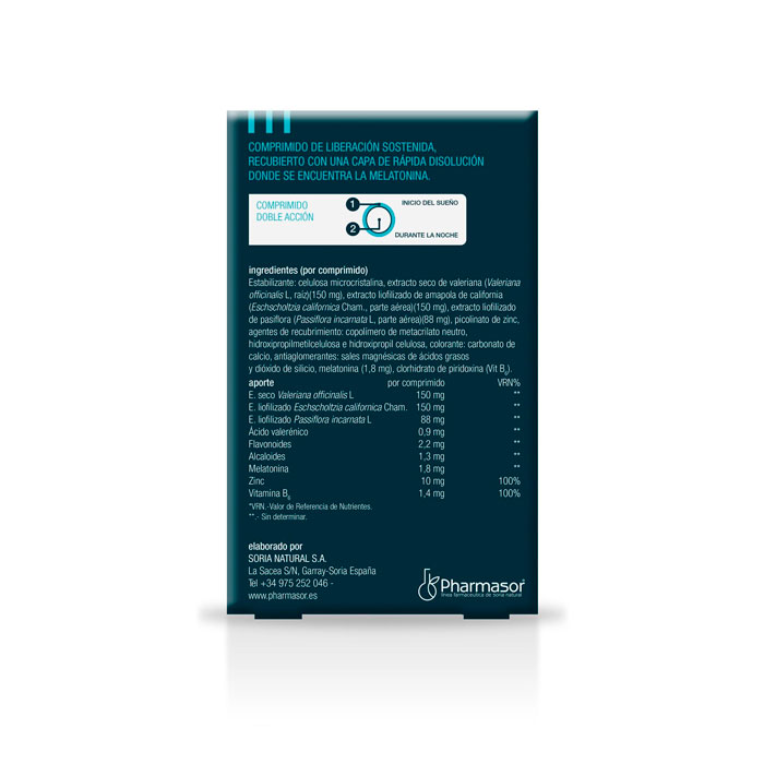 Estabilizante: celulosa microcristalina, extracto seco de valeriana (Valeriana officinalis L, raíz)(150 mg), extracto liofilizado de amapola de california (Eschscholtzia californica Cham., parte aérea)(150 mg), extracto liofilizado de pasiflora (Passiflora incarnata L, parte aérea) (88 mg), picolinato de zinc, agentes de recubrimiento: copolímero de metacrilato neutro, hidroxipropilmetil celulosa e hidroxipropil celulsa, colorante: carbonato de calcio, antiaglomerante: sales magnésicas de ácidos grasos y dioxido de silicio, melatonina (1,8 mg), clorhidrato de piridoxina (Vit. B6).