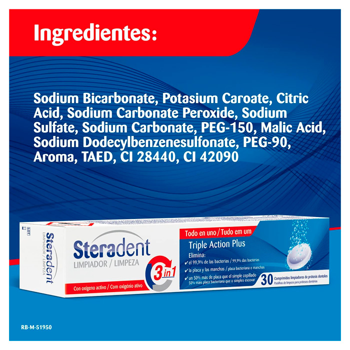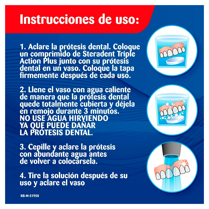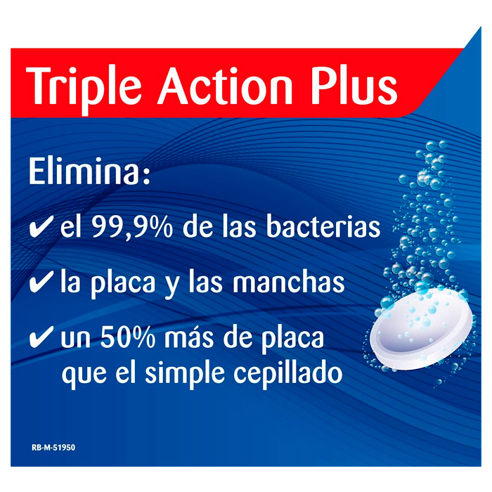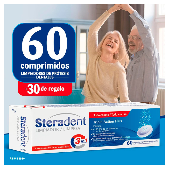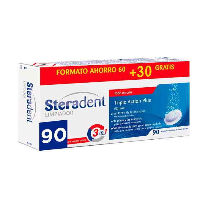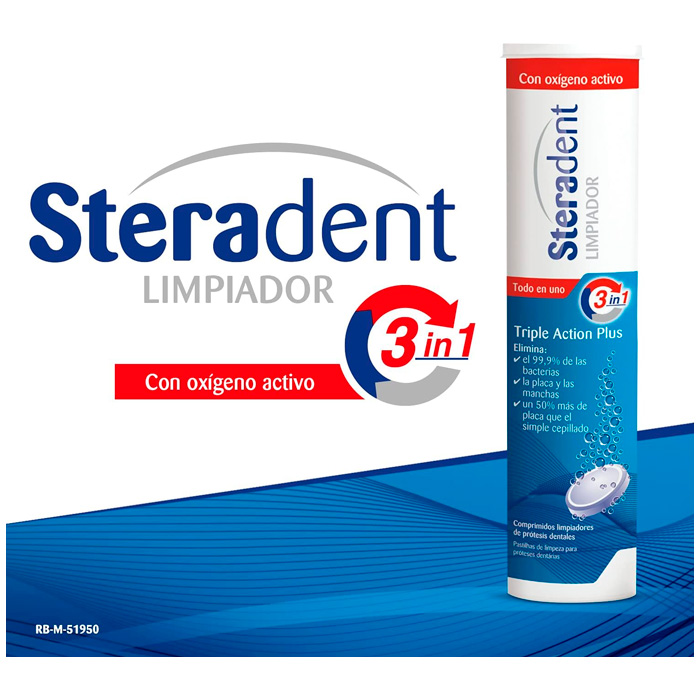 Steradent Active Plus Triple Acción son comprimidos para la limpieza de la prótesis bucal y dentaduras postizas.