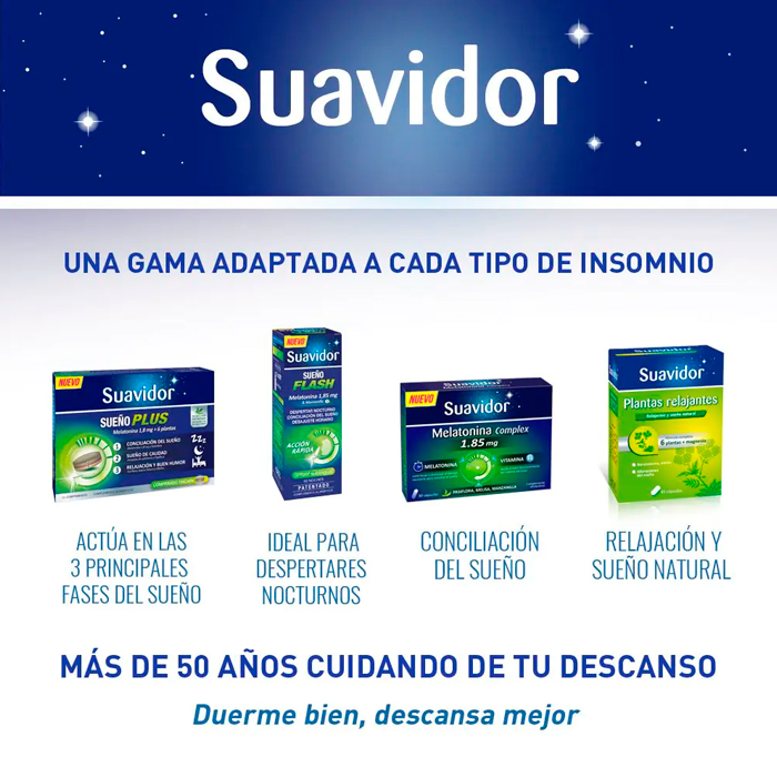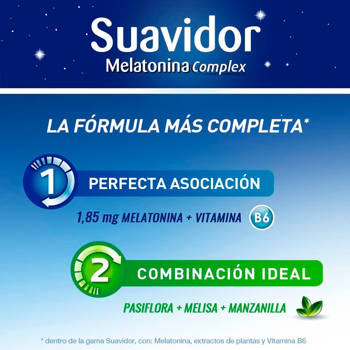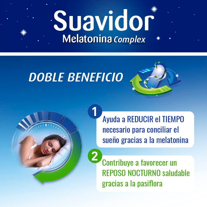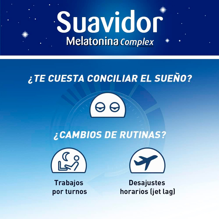 ¿Te cuesta conciliar el sueño o sufres de jet lag? Suavidor Melatonina Complex es el complemento alimenticio que necesitas para recuperar tus noches de descanso.