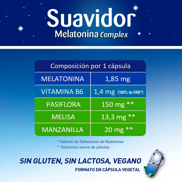 Tomar 1 cápsula al día de Suavidor Melatonina Complex 1.85mg 30 Cápsulas, preferiblemente 30 minutos antes de acostarse.