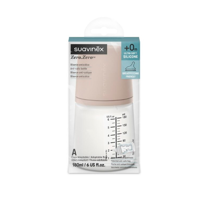 Suavinex Biberón Anticólico Zero Zero Tetina Silicona Flujo Adaptable 180ml Medium