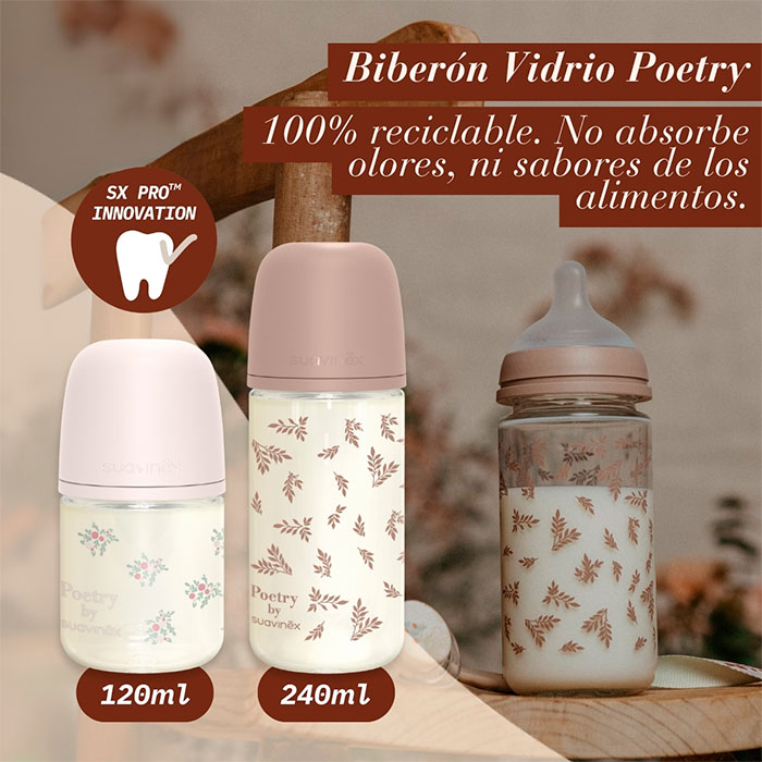 El Biberón Vidrio Suavinex Poetry Tetina Fisiológica SX Pro Silicona Flujo Lento 120ml Verde +0m es la elección ideal para las primeras tomas de tu bebé, combinando la sostenibilidad del vidrio con la avanzada tetina SX Pro.
