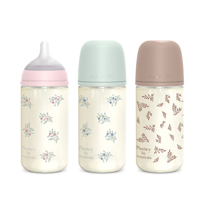 Este biberón de 240ml, de la delicada colección Poetry en tono rosa, es perfecto para bebés a partir de 3 meses.