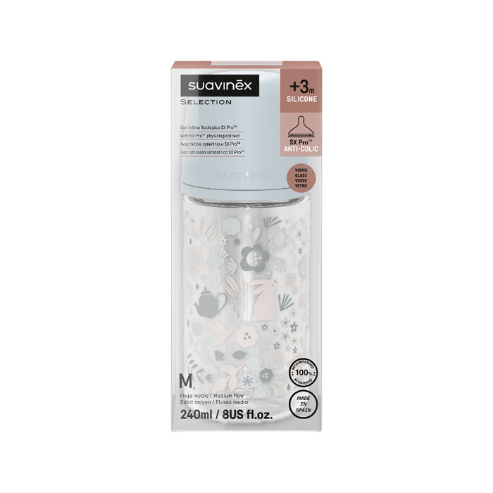 El Biberón Suavinex Wonderland 240ml de vidrio con tetina fisiológica SX Pro de silicona y flujo lento es una opción estupenda para los primeros meses de tu bebé.