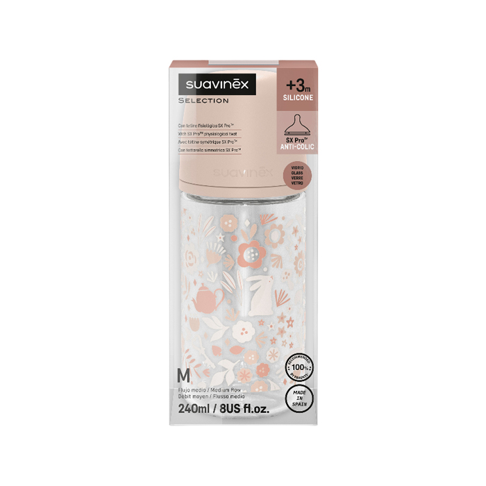 Suavinex Biberón Vidrio Wonderland Tetina Fisiológica Sx Pro Silicona Flujo Medio 240ml Rosa