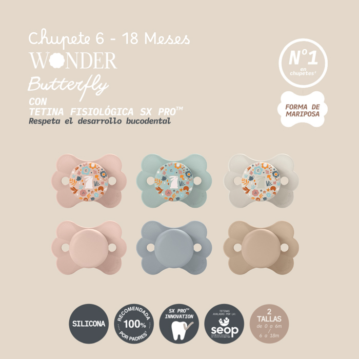 El chupete Suavinex Butterfly Wonderland, diseñado para bebés de 6 a 18 meses, incorpora la innovadora tetina fisiológica SX Pro de silicona.