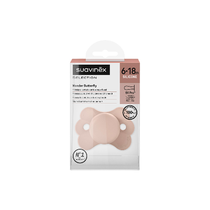 El chupete Suavinex Butterfly Wonderland, diseñado para bebés de 6 a 18 meses, incorpora la innovadora tetina fisiológica SX Pro de silicona.