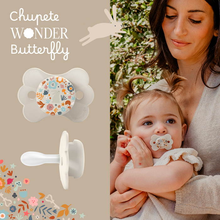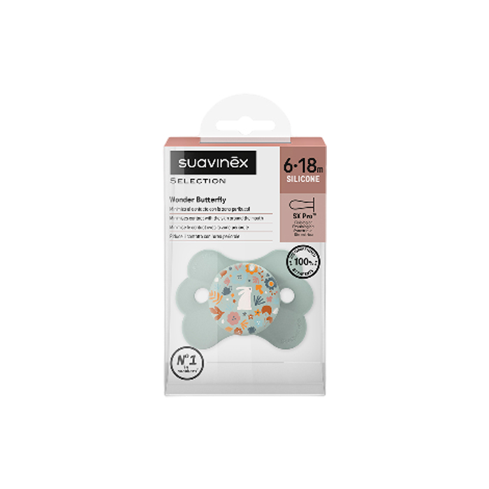 El chupete Suavinex Butterfly Wonderland, diseñado para bebés de 6 a 18 meses, incorpora la innovadora tetina fisiológica SX Pro de silicona.