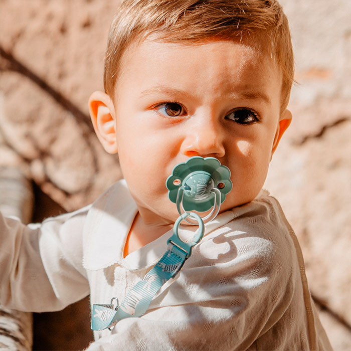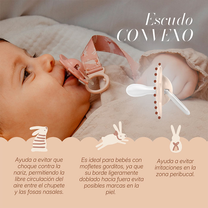 Su característico escudo redondo y convexo minimiza el contacto con la superficie cutánea, protegiendo la zona peribucal de las irritaciones producidas por la saliva, especialmente comunes durante la etapa de dentición.