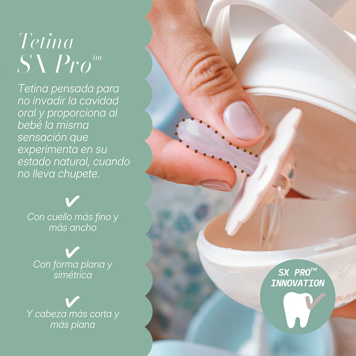 Tetina Fisiológica SX Pro: Su forma plana y simétrica deja más espacio a la lengua para que la succión sea lo más natural posible.
