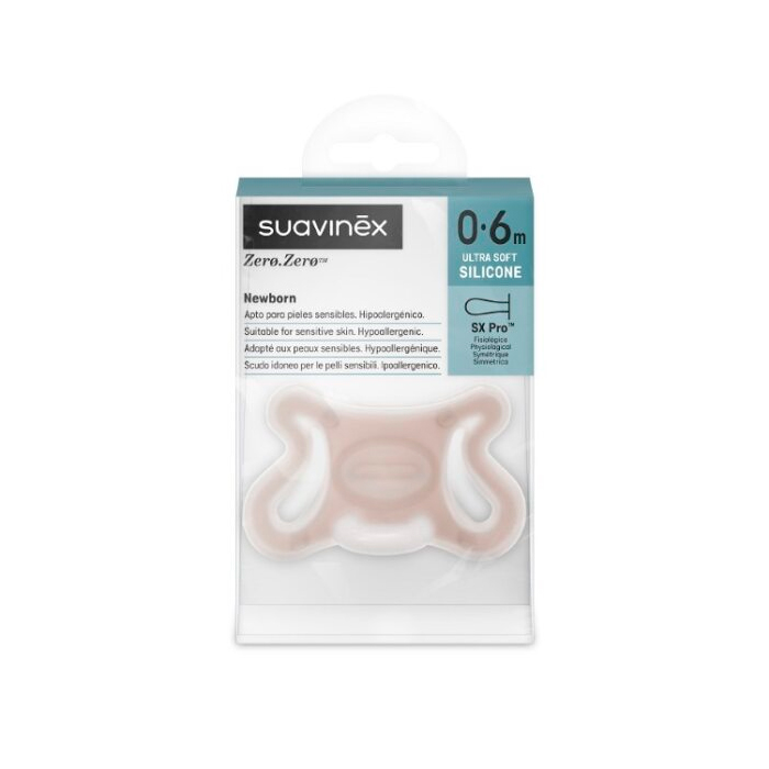 El Chupete Suavinex Zero Zero cuenta con tetina fisiológica SX Pro, es apto para pieles sensibles y está fabricado en silicona 100% de grado médico.