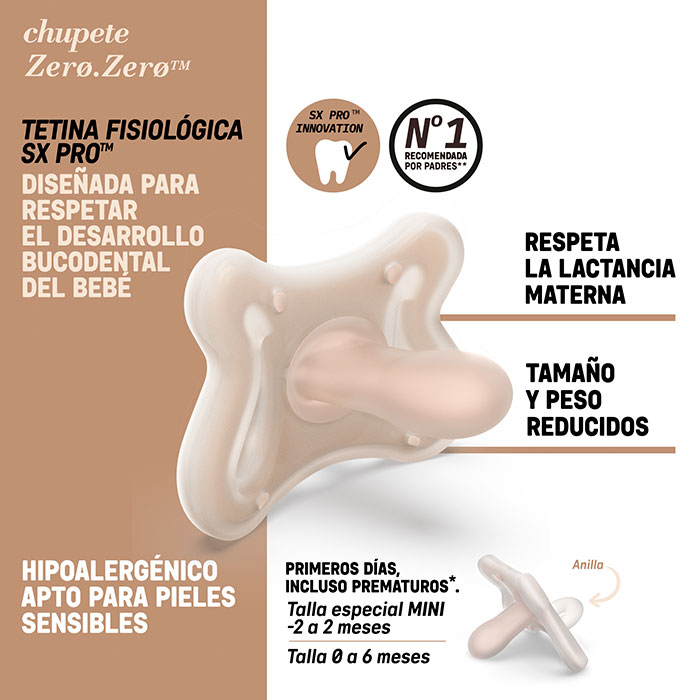 El Chupete Suavinex Zero Zero cuenta con tetina fisiológica SX Pro, es apto para pieles sensibles y está fabricado en silicona 100% de grado médico.