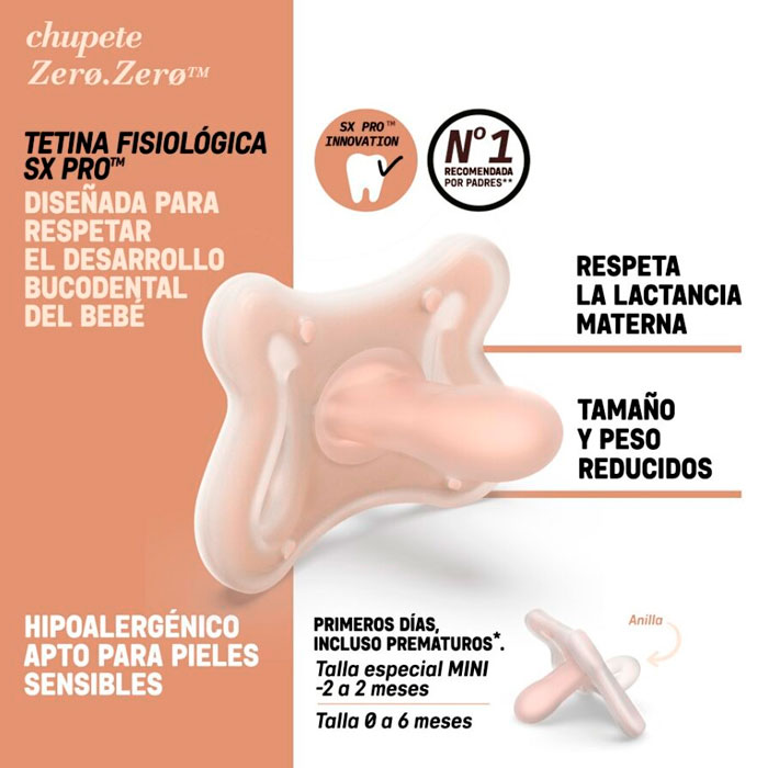 El Chupete Suavinex Zero Zero cuenta con tetina fisiológica SX Pro, es apto para pieles sensibles y está fabricado en silicona 100% de grado médico.