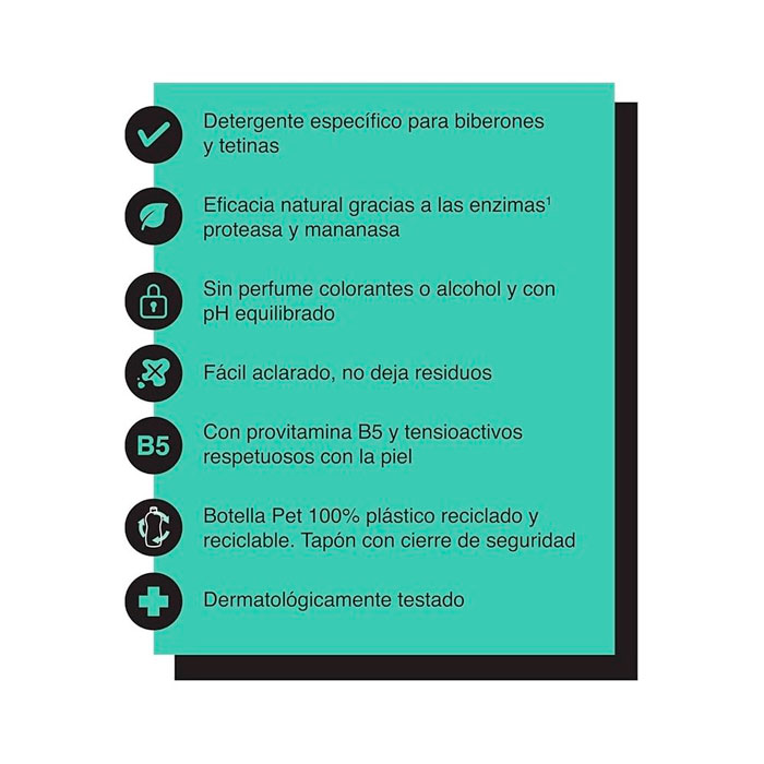 Su pH equilibrado es suave con los materiales de los biberones y tetinas, ayudando a mantener su integridad.