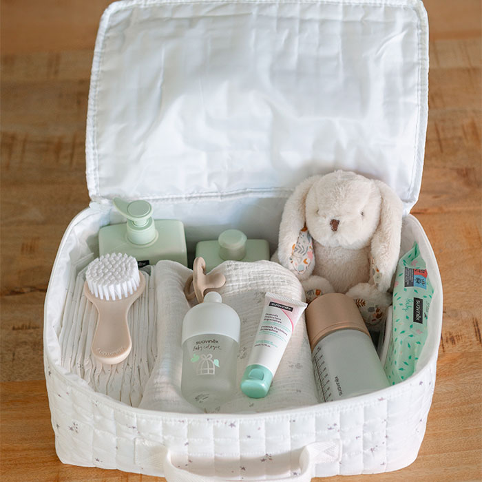 Esta hermosa maleta contiene una selección cuidadosa de los clásicos de Suavinex, perfectos para la rutina diaria del recién nacido: