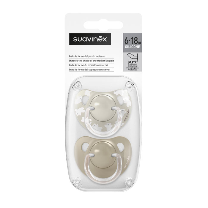 El Pack de Chupetes Suavinex Prints Wild & Free Tetina Anatómica Silicona 6-18m Gris está diseñado para bebés de 6 a 18 meses.